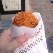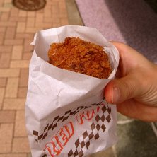 神楽坂を歩いていると、結構な人数が美味しそうに食べ歩きをしてるの。 袋にオレンジ色の文字が書いてあって、コロッケか何か…。 発見しました。「大野屋牛肉店」 松阪牛と和牛のビーフメンチ ¥260 栃木県日光ホワイトポークのポークメンチ ¥180 さて、どっちだ(笑)