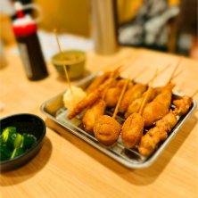 大阪くいだおれの旅⑤ 海老、さつまいも、チーズ、アスパラ、紅ショウガ(写真奥から) 追加注文でトマト、れんこん、きすを頂きました