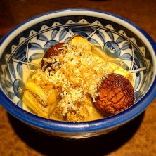 4種のスモーク。 左下から時計回りにカキのオイル漬け、フルーツチーズ、たらこ、オリーブ。