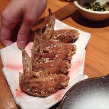 出張先の晩ごはんは、ひとり居酒屋 アボカド豆サラダ、手羽先唐揚げ、焼きおにぎり 飲み物は前に同僚と行った時にキープしてあった黒霧島