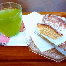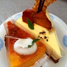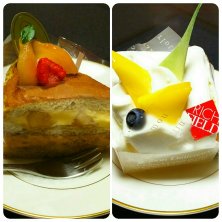 【帰省中プレイバック投稿 その3】 前々からミイルで見て気になってたケーキ屋さんに帰省ついでに行ってきました。 紅茶と桃のケーキ&季節のシフォンケーキ。 右の白い方が正体不明の葉っぱでデコってて,一見シフォンケーキとは思えません。