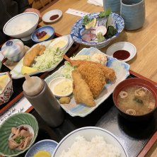 天丼セット 母の午後からの通院付き添い前に 待ち合わせて昼食 夜、お魚や日本酒たくさんの居酒屋として人気 でもお昼もひっきりなしに来る店 昼だけど半分くらいは飲んでる店 生姜ものった冷奴にくらげサラダ小鉢 穴子天がなくハゼ天ととり天で ボリュームすご 具がない茶碗蒸しの白玉が可愛かったのはご愛嬌 そして単品追加で このあとカキフライも 天丼の天ぷらあげるの時間かかるのはわかるけど さらにそれより遅れてきたカキフライ、さすが しっかりした身、揚げたてジューシーなカキフライも美味しかった!