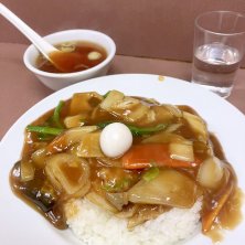 中華丼 ホントは餃子も食べたかったけど なんか歓迎されてない感じで マダム否お姉様たちが、ついでに近所の中国人?の手伝いだかの女の子なんか特に目と鼻と口があるのか確かめてるくらい みんな顔面をガン見してくるから すまなそうかつ当たり前にカウンターの席に座り注文 超久しぶりの二度目、昼は初めてだけどこんなだったけ?娘さんいた方がまだいいのかも あまじょっぱーな中華丼、カニカマとか水道風味みっしりのモツ、豚でなく鶏むね肉 とりあえずお腹減ってたからありがたかったよ 往生迎えるチャバネ眺めつつ