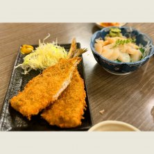 アジフライとホタテの刺身。 アジフライはサクサク、ホクホクで最高。 ホタテはヒモ付きでプリプリうま!