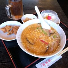 F:ランチ 酸辣湯麺 唐揚げと、搾菜、デザートつき 暑い日に熱々のスーラーたんめん 美味しかった〜👍💯 今日は長丁場の仕事 がんばろー!! ⚠️烏龍茶です笑 久し振りの鳳凰閣、駅から近いし また、近々ランチしよー。