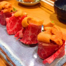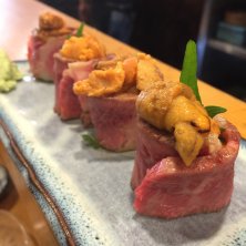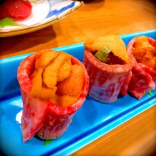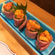 初登校です。皆様よろしくお願いします。ご存知の方もいらっしゃると思いますが東京の勝どき橋にある日本一高級な「かねます」にてA5和牛と海栗のマリアージュ、獺祭純米大吟醸でいただきました。