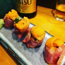 これを食べたら悶絶! 霜降りの極上の牛肉で極上のウニを巻いたその名も、牛肉のウニ巻き! 口の中に入れると自分の体温でとろけていきます(^^;; 立ち飲みの名店! しかし油断するなかれ。 一品の値段が 2500円なり^_^