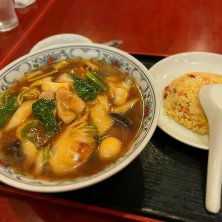五目湯麺に半チャーハン。 野菜たっぷり餡がメチャ熱! 火傷注意⚠️