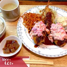 ランチはクリームコロッケとエビフライ ピンクのタルタルソースに一瞬ビックリ( Ꙭ).ᐟ お漬物を刻んだタルタルソースでした😊