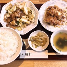 おまかせ定食 今日は豚肉と豆腐と野菜のピリ辛炒めに棒棒鶏 なかなかのボリューム!