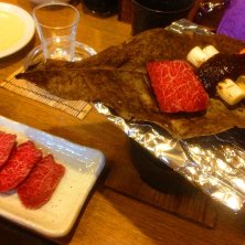 馬肉の朴葉焼きです。 炙る程度でちょうどよい。 味噌と一緒に!すんげ馬かったwww
