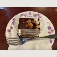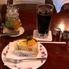 ケーキセット¥950でアイスコーヒーとペシュールとかいうケーキを頂きました!黄桃?のケーキでババロアみたいな食感♡ ㊧㊤にあるのは試食用ゼリーだそうで、名前はヴィーナスの誕生(笑)