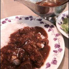 カレーセット、1050円。サラダ、コーヒーに季節限定ワインゼリーまで付いてきた。甘口のカレーによく合うトロトロに煮込まれた牛肉は食べやすいサイズでたっぷり。ハヤシライスの方も食べたくなるなあ。