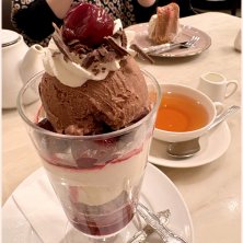 チョコとチェリーのパフェ、シュヴァルツと紅茶 バレンタインだしたまにはチョコレートも (結石になりやすいので食べすぎ注意⚠️) 紅茶もウィーンのデンメアティーハウス、ウィーンぽい(?)内装も素敵です