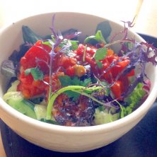 名残ぶりの塩麹焼き丼 バジルマヨネーズ サルサ風のトマトソースものってます。 塩麹でこんがり焼いた和風な鯖が相棒だとバジルの香りがシソのように爽やかな風味に!! 色々な野菜もたっぷり入ってビタミンたっぷり!(た、たぶん・・・) ピクルスやケッパーの隠し味もまた美味なのであります!! これすきだー!! カウンターの景色も素晴らしいー!