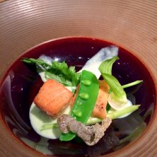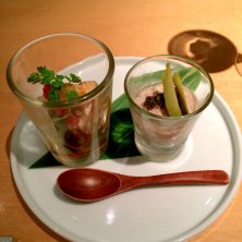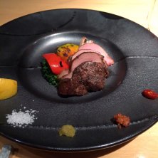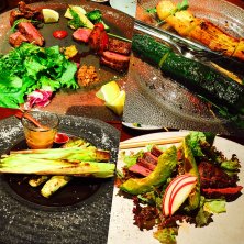 ガリシア豚と農園野菜炭火焼 付け合わせにコチジャン、わさび醤油、柚子胡椒、塩、オウゴンカン