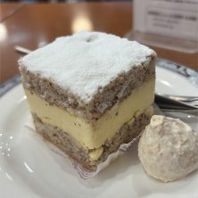 ツヤツヤのチョコがコーティングされたケーキに、ガナッシュクリームとラムレーズンがサンドされています。ラムレーズンのお酒が結構効いていて美味しい☆ 両端はアーモンドスライスが付いていて、良いアクセントになっています。