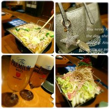 今日の晩ごはん☆ 年始に間違えてしまったダウンコートを取りに来たついでに飲んでます(^o^;) 感じの良い店長です♪ *超達人のザ・プレミアムモルツ *ちりとりもつ鍋醤油味 ↑初!ちりとり鍋でしたq(^-^q) プレ☆birthdayディナーの様になってしまった! 🎀色々買って貰いました