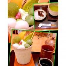 うぐいすパフェ♪ よもぎ団子やわらび餅、バニラアイス 下には焙じ茶の寒天がいっぱい入った 春の新作パフェ♪ 食べ終わると、お煎茶と塩昆布が供される 甘くて美味しくて、お煎茶と塩昆布でお口がさっぱりした(๑・̑◡・̑๑)