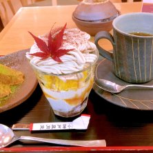季節限定 紅葉パフェとわらび餅♪ ミルクティー 小豆とソフトクリームの上に秋色ロールとカラメルソースを絡め、バニラとモンブランクリームで仕上げ♪ トップに紅葉を添えて小さな秋のパフェ わらび餅もモッチリと美味しかった(((o(*゚▽゚*)o)))♡