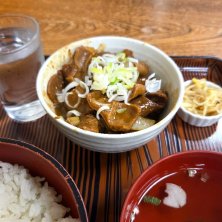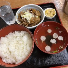 あべちゃんの牛にこみ定食にポテトサラダ♪もつの中には煮込んだ豆腐。途中まで普通に食べて、後半ご飯にぶっかけて食べるのが最高!