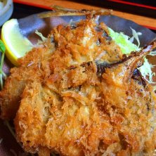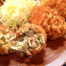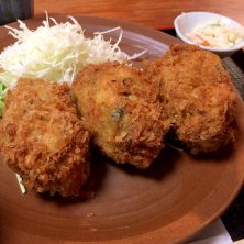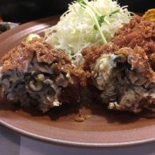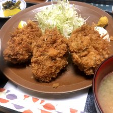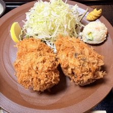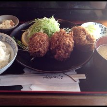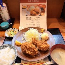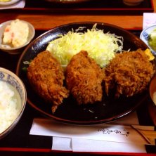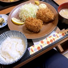 人形町にある割烹 三友でカキフライ定食(上)を頂きました!拳大の迫力あるビジュアルに圧倒されました。一つにカキが六個ほど入ってるとの事です(^^) フワフワ、サクサクで美味しかったでーす!