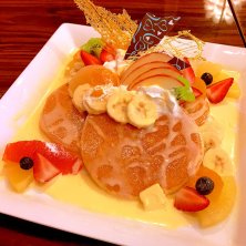 天神橋筋 CREAM KITCHEN クリームキッチンプレミアム マダガスカル産バニラのアングレーズソース、自家製メープルシロップ、生クリーム、フルーツたっぷりのパンケーキ♪ 今まで食べた中で一番豪華なパンケーキです^ ^