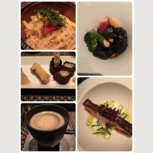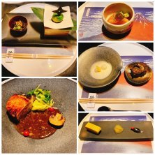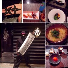 くのいちに歓迎、接待されての ご馳走の数々。小野小町なる美肌ドリンクから始まり、フォアグラの手裏剣?を頂き、次々美味しいものばかり。 メインは、真っ黒な酢豚か、鮭の西京焼き。西京焼きが、特に最高に美味でした。 デザートは、リンゴのコンポート、撮り忘れました!