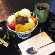 本日の鎌倉散策での甘味処♪ クリームあんみつ😊 久しぶりに頂くあんみつ。 お盆に生花をあしらってあり、お店の方のおもてなしの気持ちが伝わってきます。 黒蜜とろりで、歩き疲れも吹き飛びました。お土産のどら焼きも購入してきました。