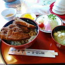福井県敦賀市 市内に数店舗有るソースカツ丼の店、敦賀ヨーロッパ軒のソースカツ丼。 福井県の名物料理の1つ。福井のヨーロッパ軒から暖簾分けをされた店。 福井と敦賀ではロースカツ自体は変わらないが、使用しているソースが異なるそう。福井ではイカリソースを使用して工場で調合、敦賀ではカゴメソースを使用して店内で調合されているそう。 レンタカーを敦賀に帰した後、新幹線の最終迄時間が有ったので、ギリギリで滑り込んで食べる事が出来た。 ボリュームが有って美味しかった。今度は福井のも食べてみたい。