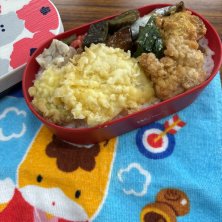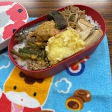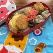 わかめごはん🍚、ししゃも、アメリカナマズ天ぷら🍤、おでん🍢、しゅうまい