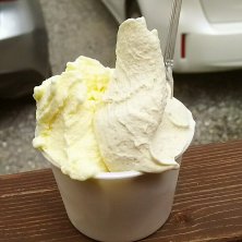 ジェラート 右:しぼりたて牛乳 左:かぼちゃ 8月15日、どしゃ降りの中食べに行った☔️ お客さんも多かったから、何だかバタバタと注文して、慌ててたべたけど、いつも美味しいジェラートです✨