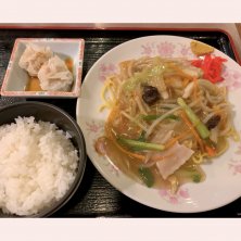 ラーメン軽中華居酒屋「天壇」の日替わりB定食。 あんかけ焼きそばハーフ+焼売+小ライスで600円。 いかにも軽中華という質感だが、600円ならリーズナブルと言えるでしょう。 ビル地下の薄暗い場末感がどことなくシュールです。