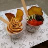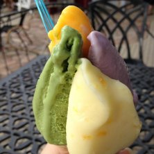 ジェラート4種盛り 宇治抹茶、柚子、紫芋、マンゴー 雨が降ってきたのて、お迎えの依頼が…。ジェラートのお店でしたので、3時のおやつ‼