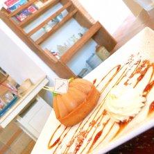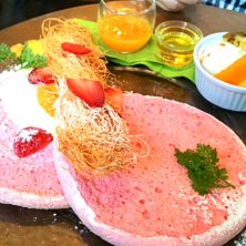 ママさんが、キッチンで料理研究をしているうちにお昼になってしまい、買い出しを兼ねて外食に。(^o^;) 昨日、暑さで挫折したお店を目指します! ミルフレさんのご推薦のお店ですが、暑いなか、場所間違えたりして、お店に辿り着くのに一苦労!m(__)m 並んで待ってようやく食べました。 (^◇^) 季節限定のマカロンスフレパンケーキです!(*^^*) こちらの品は、普通のパンケーキやホットケーキとは違う独特の食感と味でした!(*^^*) マカロン味のこういうお料理ができるんですね