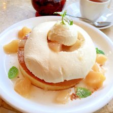 アクイーユ 桃のレアチーズパンケーキ☆ 念願のアクイーユの桃のパンケーキ♡ 季節の幸せシリーズの天使のクリーム「クレームダンジュ」パンケーキの第2弾!! 山形県産の桃とふわふわ食感の濃厚レアチーズをたっぷり使用した、ぜいたくなパンケーキ♡ リニューアルしてから初めて来たけど、パンケーキがもちもちになってすっごく美味しい♡ 桃のコンポートも甘くてとろける(>_<)♡ 嫌なこと忘れられる笑