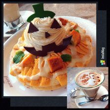 今日のお昼ごはん♪ ☆ハロウィンパンケーキ ☆アップルシナモンラテ @アクイーユ 念願の初アクイーユ! ネットでこのパンケーキみて、どうしても食べたくなって。。 アップルシナモンラテ、シナモンがすごくきいててアップルパイみたいでおいしかったです。 パンケーキは、パンプキンクリームも生クリームもアイスもたっぷりで、いろんな楽しみ方ができました。生地自体もすごくおいしい♡ けど、ボリューミーでちょっと塩気がほしくなりました笑 今度はだれかといってシェアして、グラタンとかも食べてみたいなあ〜