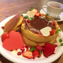 アクイーユ バレンタインパンケーキ とちおとめとショコラソースのフォンテーヌ☆ アクイーユでバレンタインパンケーキ♡ 写真に夢中でピンクのハートかけたw モチモチのパンケーキとビターチョコのフォンデュで大人なパンケーキ♡ 濃厚で美味しかった♡