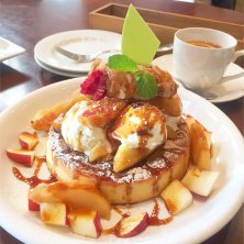 アクイーユ 紅玉りんごのパンケーキ☆ 季節限定のりんごのパンケーキ♡ 時間をかけて甘くソテーした一個分の紅玉りんごとバニラアイス、フレッシュクリームがトッピングされていてとっても贅沢♡ キャラメルクリームとシナモンの香りも相性バッチリ!! 生地もふっくらモチモチで美味しい♡