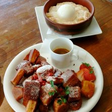 ドーナッツ パンケーキ、アッフォガード風。 カリッとした揚げパン風なパンケーキに、焼きマシュマロの上にアイスがのっていて、そこにエスプレッソを注ぎます。 このお店、他にも変わったパンケーキがあったので、また行きたいな♪