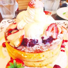 期間限定🍓苺たっぷりでテンション上がる⤴︎集まったみんなお誕生日が近くてバースデー仕様🎂可愛い❤️さっくりしっとり目のパンケーキ🥞はもちもちした食感で美味しい🙌モンブランのパンケーキも洋酒を使った大人のケーキ⤴︎生クリームもさっぱりしていて案外ペロリ😋