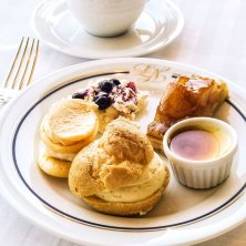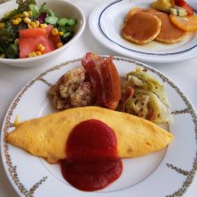 一度泊まってみたかったホテルニューグランド🏨 サラダを先に食べてしまったため、オムレツとウインナーだけの投稿💦 洋朝食 ジュース、サラダ、卵料理、ウインナーなど、パン盛り合わせ、ヨーグルト、紅茶かコーヒー。 山下公園に早朝散歩にも行けて良きでした。