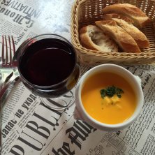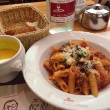 桜エビとキャベツのリゾット 桜エビの塩気と主張しすぎないトマトクリーム、歯ごたえが残るキャベツがいいバランス。 ランチはフランスパン、かぼちゃのスープ付き。セットなのに食後の紅茶がすごく美味しかった。 店員さんもほとんどフランス人、お客さんも外国人がちらほら。お店の内装もパリのビストロ風で、外国で食事をしているような気分が味わえる。