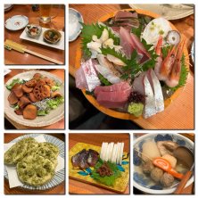 ♪長芋の唐揚げ〜まぐろタルタル ♪ポテトサラダ ♪お刺身盛り合わせ ♪ガス海老の唐揚げ ♪のど黒一本焼 ♪だし巻き玉子 ♪ビール ♪農口(日本酒) 魚が美味いし、酒も美味い^^ 金沢の夜を満喫しました♪( ´▽`)