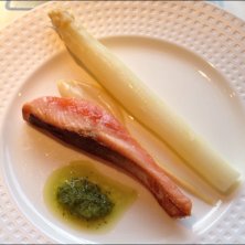 きのうの夜ごはん② 前菜。 ホワイトアスパラと桜鱒のかりかり焼き。 ホワイトアスパラジューシー!