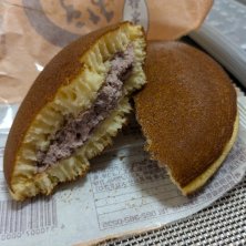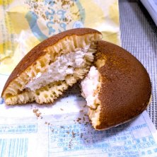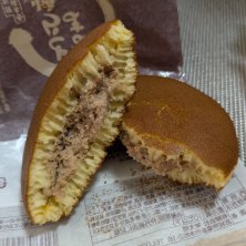 生どら焼き ふんわりして甘さ控えめの柔らかい焼き生地で小豆の粒餡と多めの生クリームと混ぜ合わせたクリームをたっぷり挟んだどら焼きです。因みに粒餡は細かく刻まれた小豆になります。ともかくマイルドなクリームで、甘さ控えめの生地との相性が抜群です。とっても美味しくって宮城発祥の生どらが全国へ広がるきっかけになった味なのも納得です。