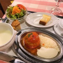 何年ぶり?にきたら、 前は平日でも行列だったのにすぐ入れた。 しかも限定20食でいつ来ても売り切れだった 丸ごとトマトの肉詰めロースト プロヴァンス風 サラダ&デザートセット 2210円 も残ってた。 日替わりランチのメニューがイマイチ気分では無かったから、トマトがあまり好きじゃないくせに頼んでみた。 カリフラワーのポタージュとパンとこの見た目は地味なデザートがやたら美味しかったな。