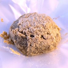 うぐいす餅 やや固めに仕上げたこし餡を求肥で包み整形し、青きな粉をまぶしたお菓子です。こし餡と求肥の組み合わせは勿論バッチリですが、これに青きな粉が加わるとグッと美味しさが上がる気がします。とっても美味しいんです。