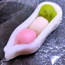 花見団子 ういろう生地で3色のあんこ玉を包んだちょっと変わった形のお菓子です。もっちりしたういろう生地が美味しいです。そしてびっくりするのが桃色のあんこ玉です。これが白味噌餡なんです。ちょっと驚く美味しいお菓子です。