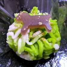 干支午 道明寺を芯として翠の練りじょうよのそぼろをまぶしたきんとん菓子の上部に干支の午の形に成形された羊羹が載った干支菓子です。勿論、練りじょうよの味わいが素晴らしく、芯の道明寺の食感も素晴らしく美味しいです。